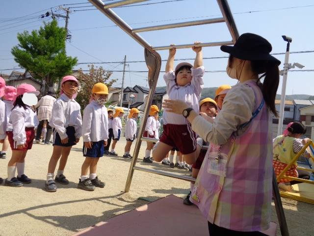 最近は、園庭で、運動遊び(うんてい・鉄棒・平均台)やを行っています。