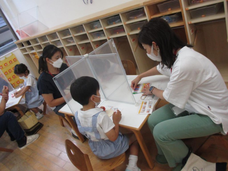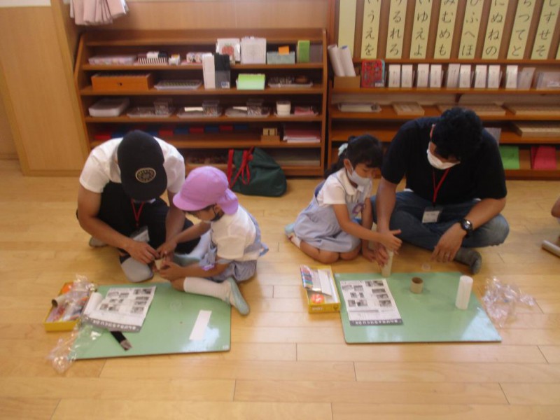 幼児クラスでは、お部屋の中で、ふれあい遊びや製作を行い、おうちの方と協力しながら一生懸命取り組んでいました。