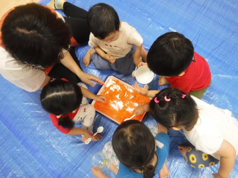 食紅で色付けした綺麗な色の寒天に目を輝かせる子ども達。