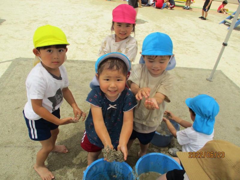 泥んこコーナーでは、泥の感触を楽しみながら、お団子を作ろうと頑張ったけど、ハンバーグになってしまう可愛らしい姿も見ることが出来ました。