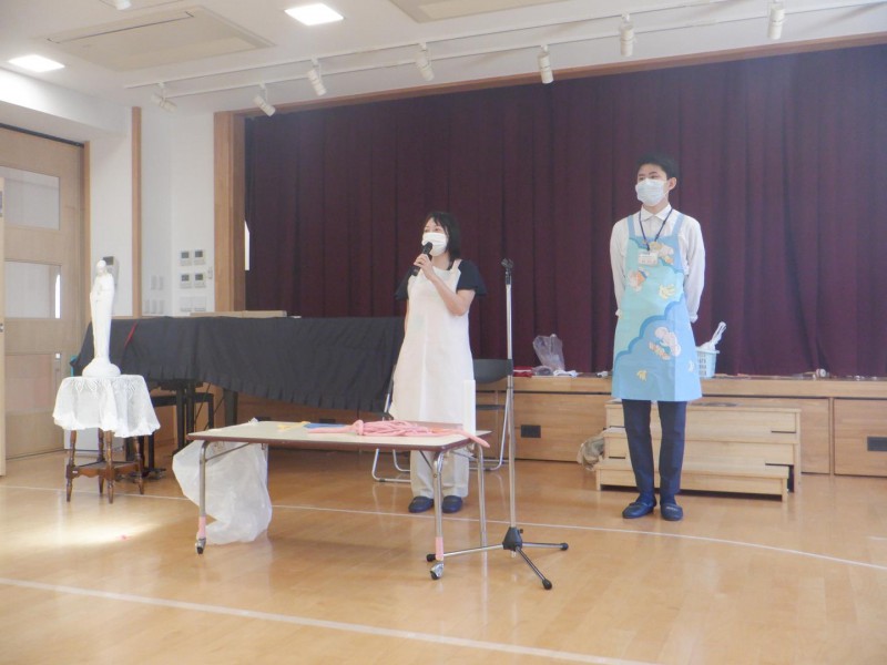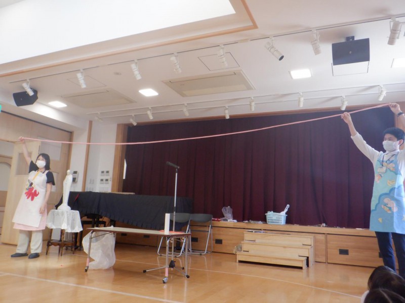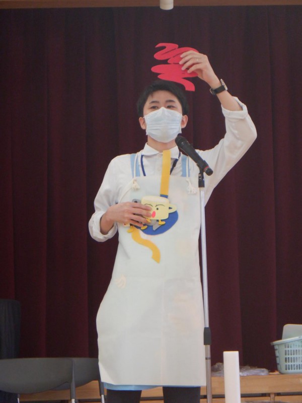 エプロンシアターを使い、食事が体の中に入って、排せつ物として出るまでの仕組みを教えてくださいました。小腸の長さクイズでは、さすが年長さん!一発で答えが出ました。答えは、6メートルもあるそうです。ウンチを出しやすくするには、果物・野菜を食べましょうねとおしゃっていました。