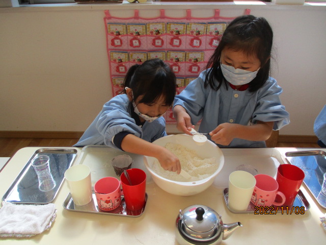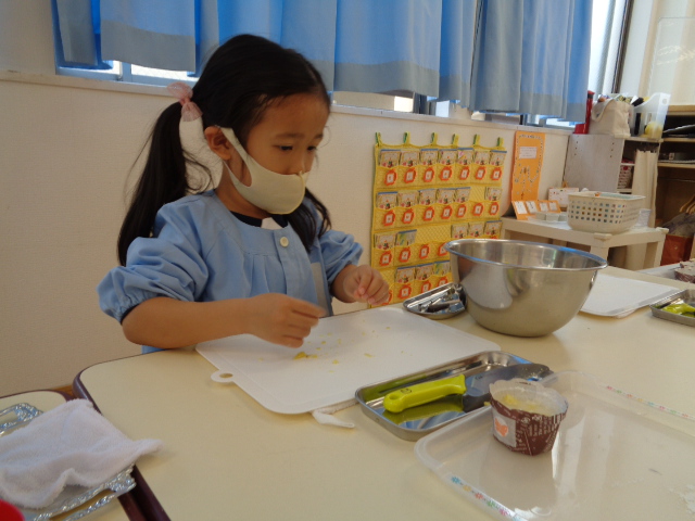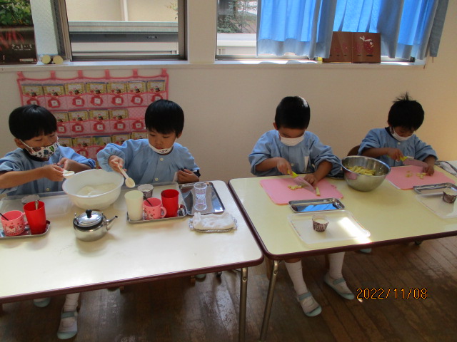 クッキングでは、お芋ほりで収穫したさつまいもを使い、おいものカップケーキを作りました。