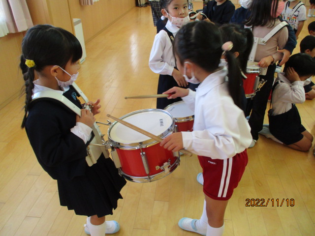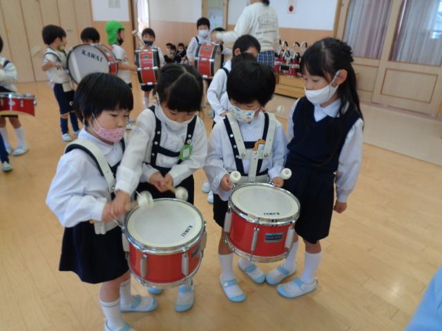 鼓隊遊びでは、年長組のお兄ちゃんお姉ちゃんに楽器を教えてもらいました。