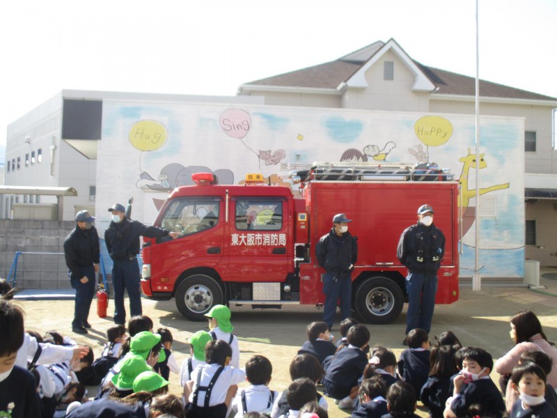 全園児参加の毎月行う避難訓練がありました。今回は、東消防署の方に来ていただき~消防訓練~を行いました。