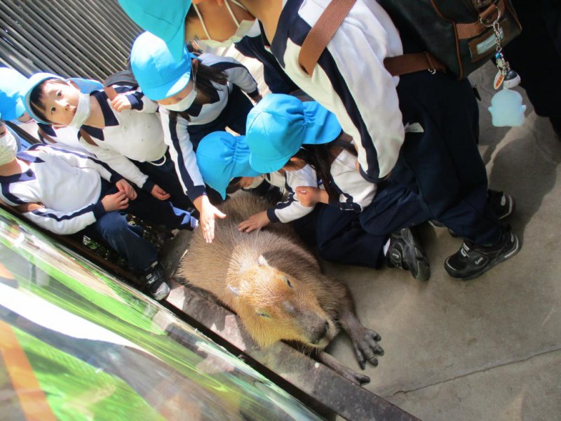 カメやカピバラは足元にいて、優しく撫でているお友達もいました。