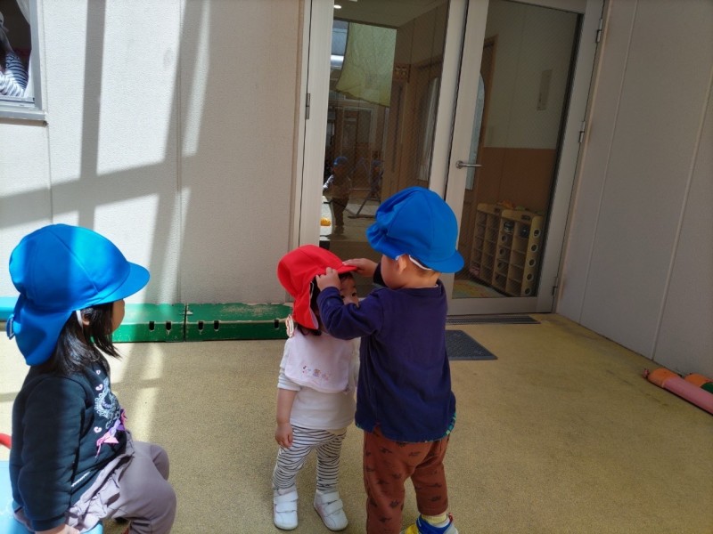 進級したあひる組さんは、最初は小さいお友だちに戸惑っている姿も見られましたが、鼻水が出ているとティッシュを持ってきてくれたり、帽子をかぶせてくれたりとお世話をしてくれるようになっています。