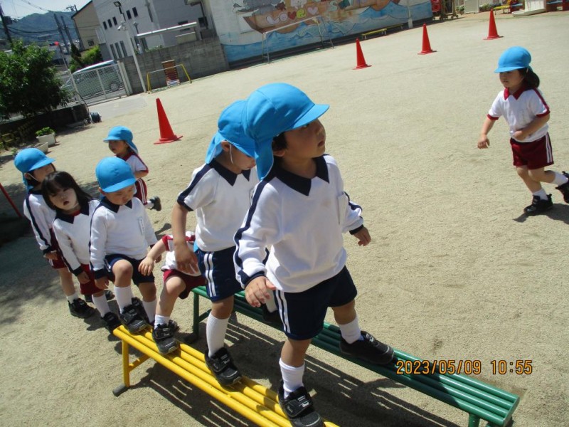 運動遊びでは、平均台や鉄棒、フープを使って身体をいっぱい動かして遊びました。