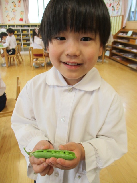 「上からむくか下からむくかどっちがいいのかな~?」「しわしわの皮の方が、実が大きい」や「いくつ入ってる~」や「赤ちゃん豆がある」「こんなにきれいに並んでるよ~」たくさんの発見の声が上がりました。