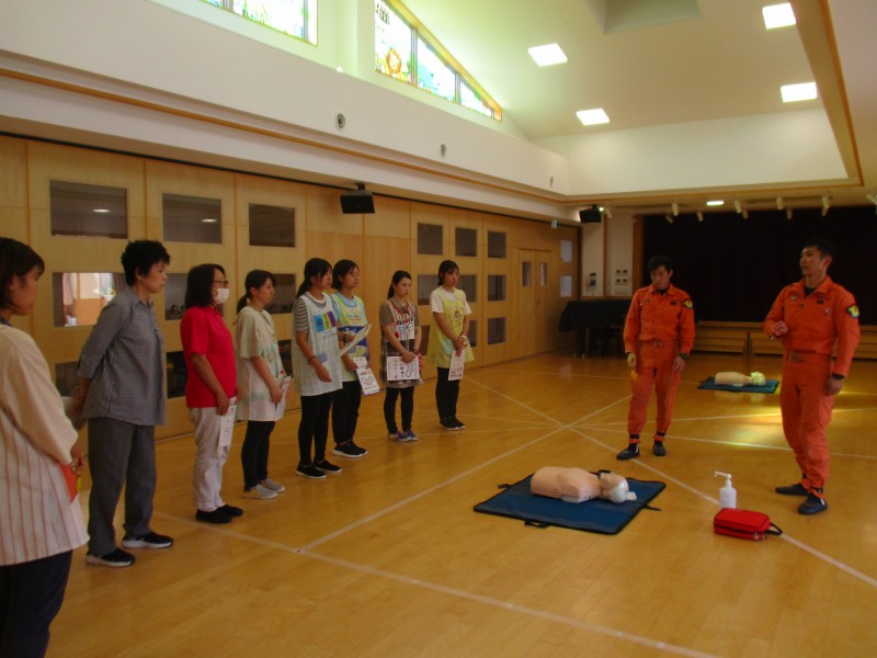 本日、東大阪市消防局の方が来てくださり、職員のAED講習会を行いました。