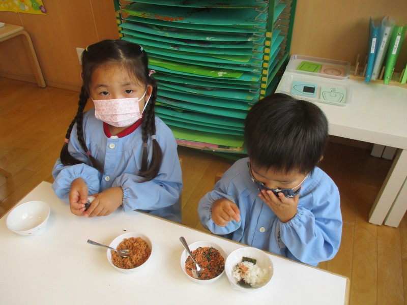 たまご、おかか、たらこ味のふりかけ、鮭フレークの中から好きな味を選び、自分で入れて
