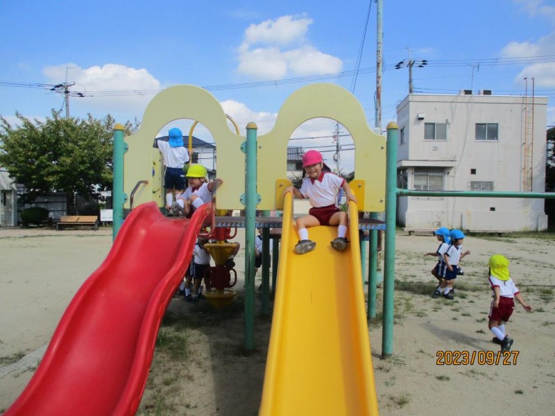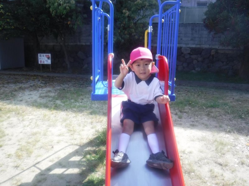 大きなブランコ、すべりだい、、落ち葉もたくさんあってみんなで楽しく遊びました。
