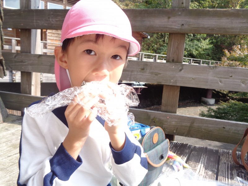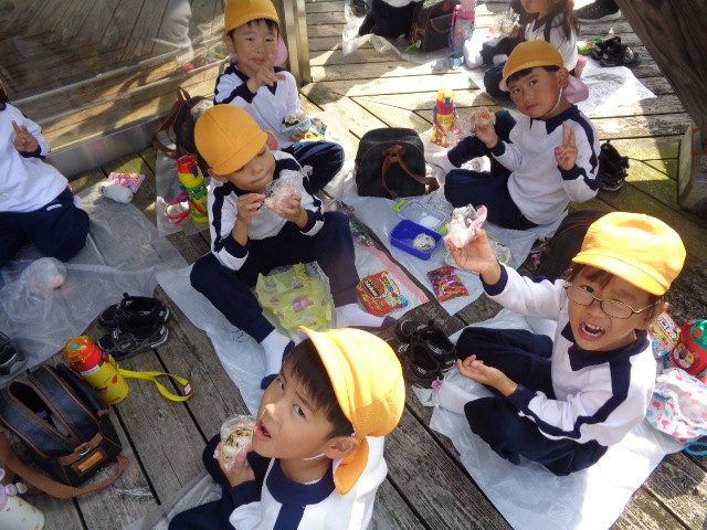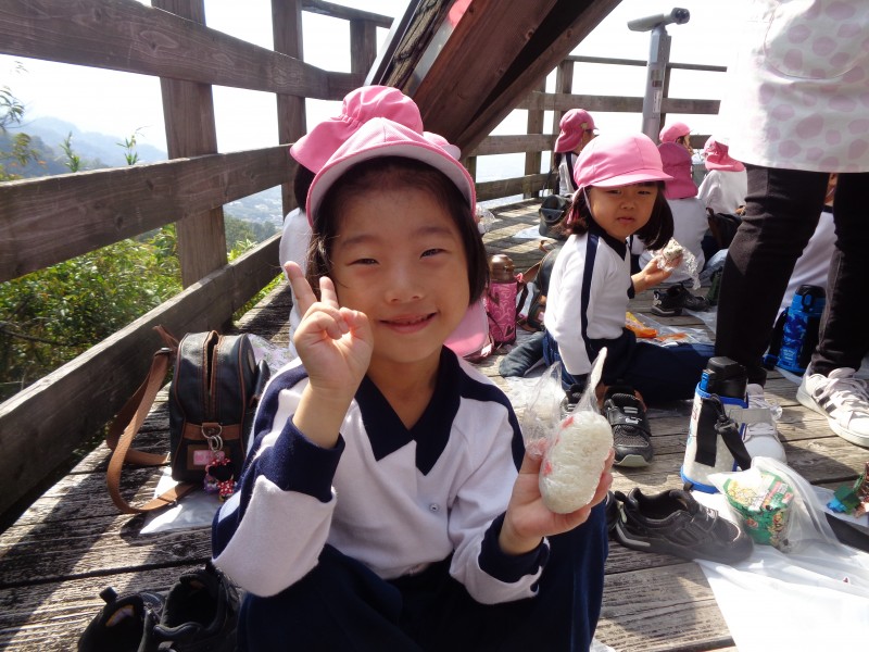 景色の良いところで、おうちの人が作ってくれたおにぎりと自分の好きなおやつを食べました。