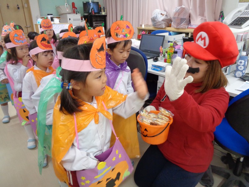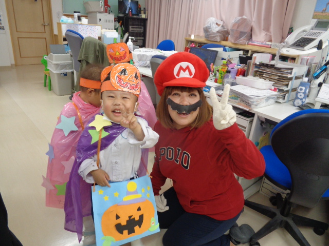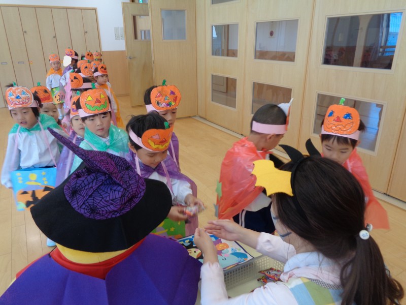 イス取りゲームをしたり、自分たちで作ったマントとお面をかぶり、かぼちゃのカバンを持ってお菓子をもらいに行きました☆