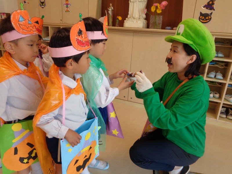 「トリックオアトリート」と言えたら、お菓子をもらうことができ、子どもたちはとても喜んでいました!