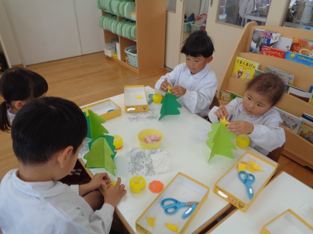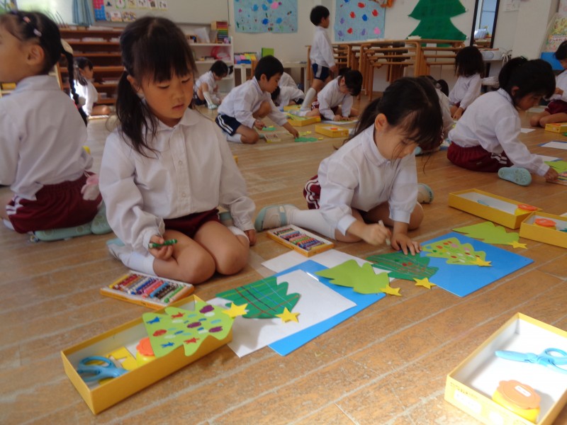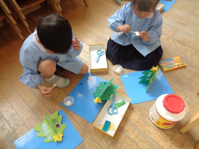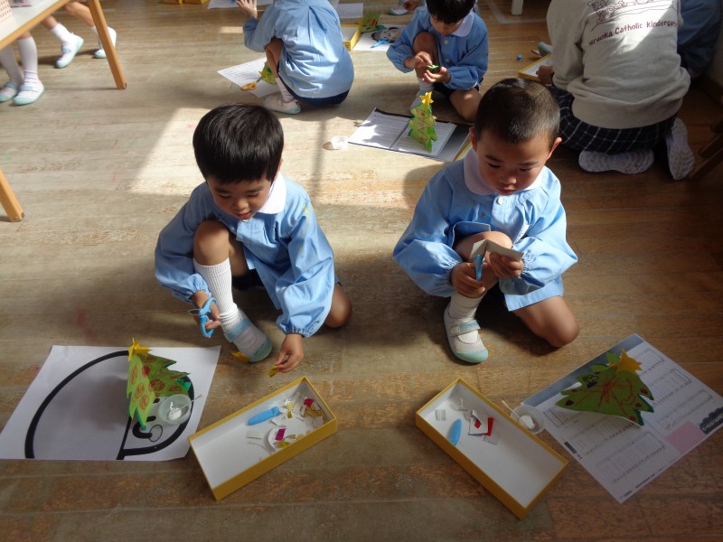 イエス様のご誕生について、園長先生から話を聞いたり、クリスマスツリーを作りました!!