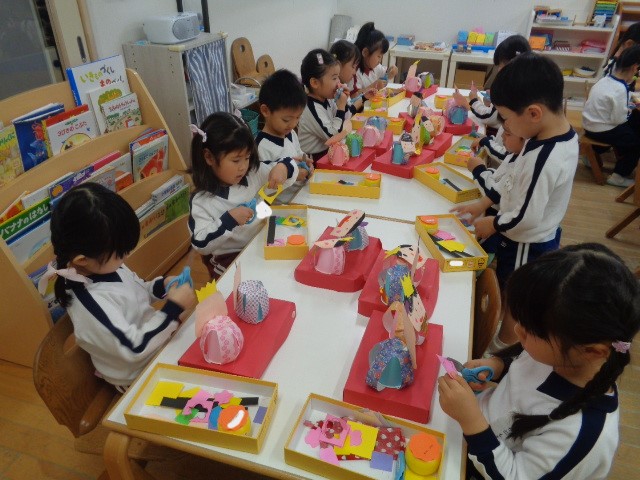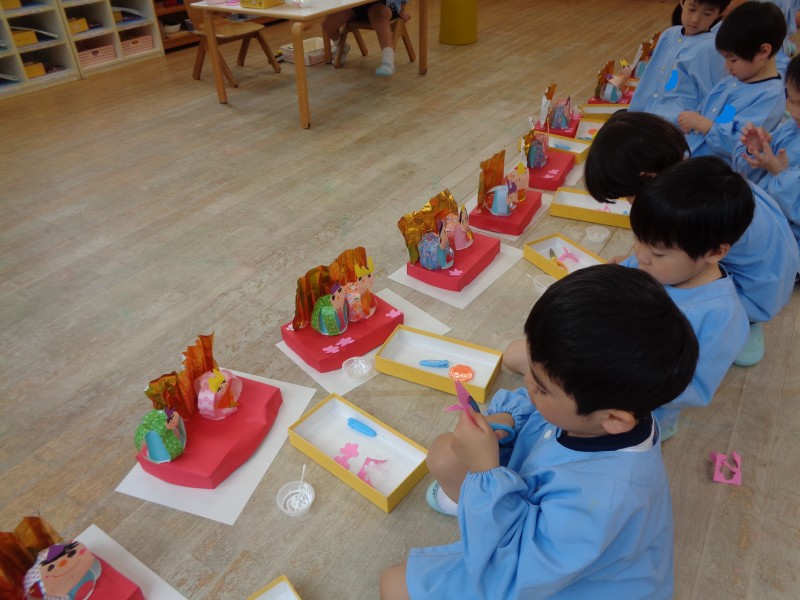 最近は、ひなまつり製作をしました。紙コップを使っておだいり様とおひな様を作りました。