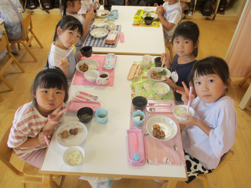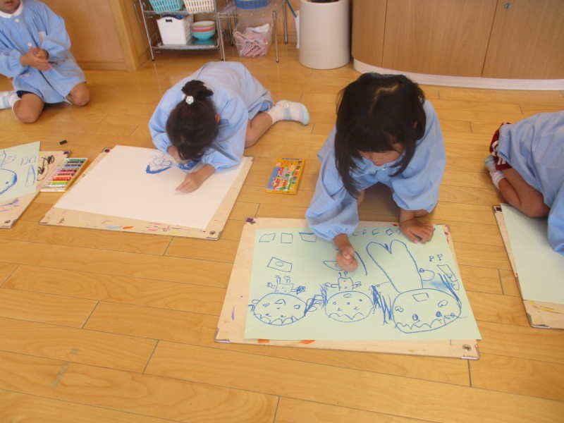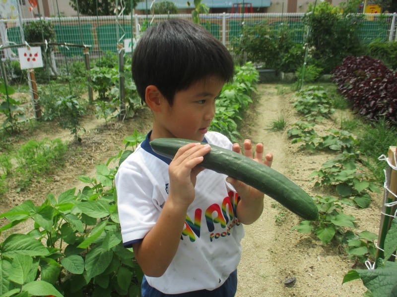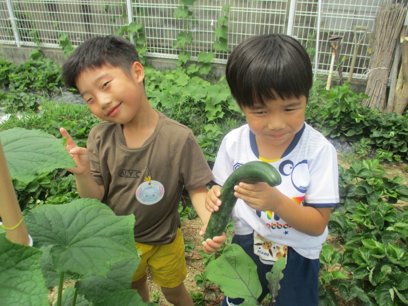 最近の年長組では、お友達と遊んだり、野菜の収穫、お絵かき、夏祭りを楽しみました。