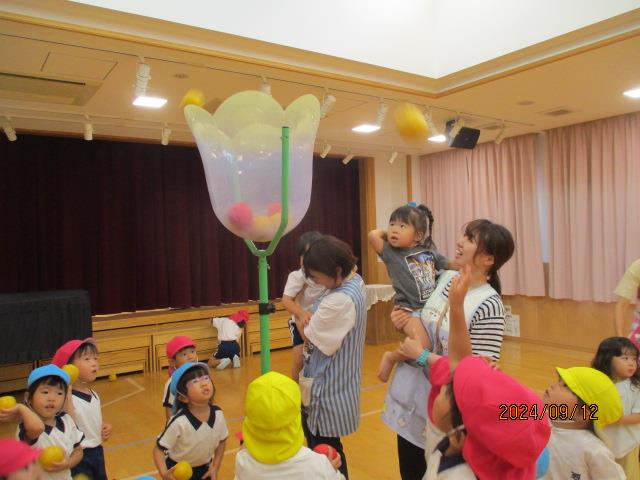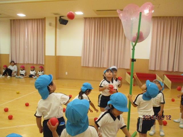 先日ホールで玉入れ遊びもしました。あひるさんの小さいお友達も遊びにきてくれました。