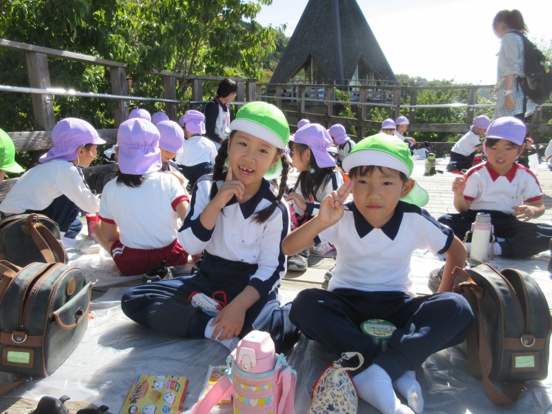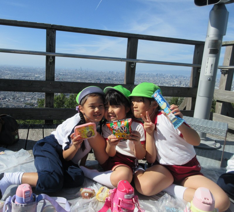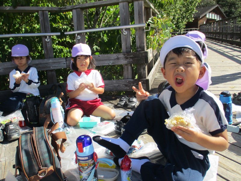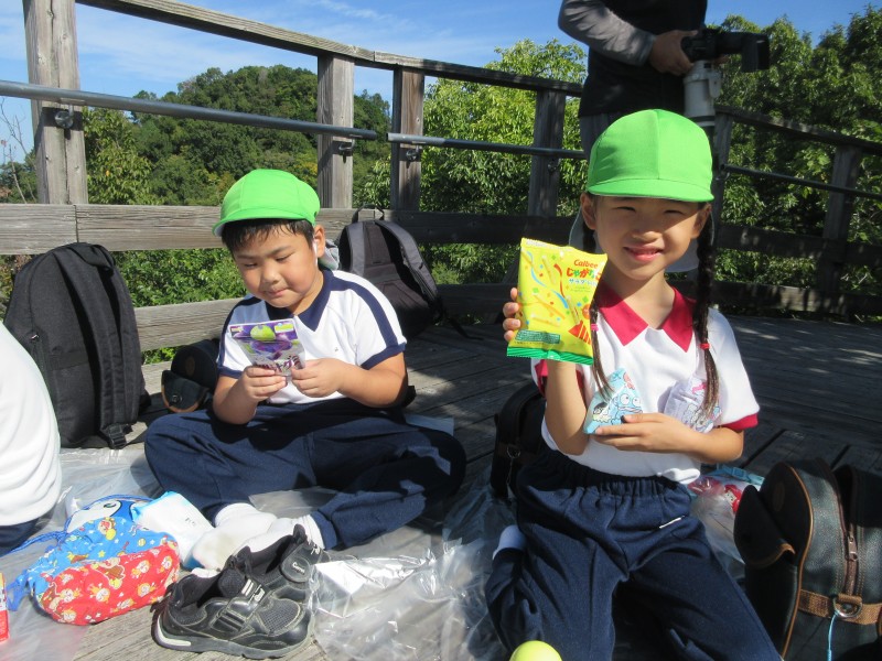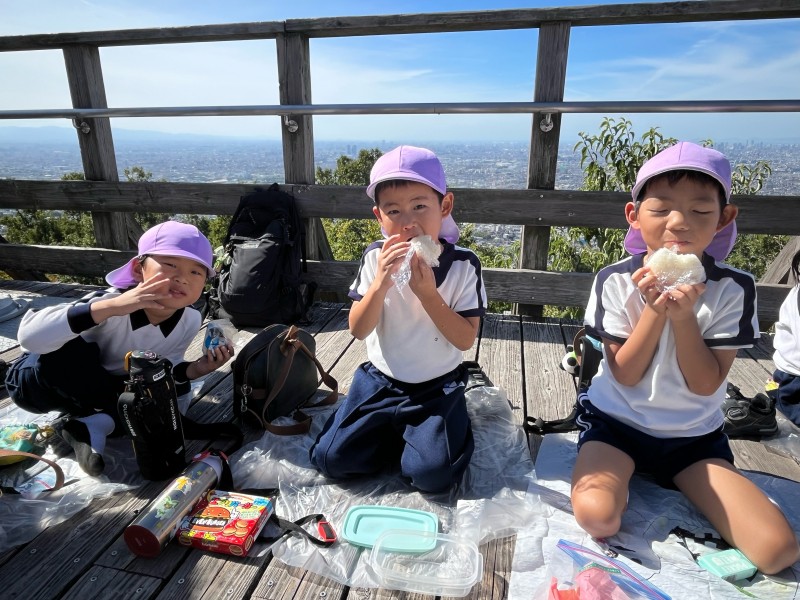 子どもたちは、綺麗な景色の中で、おうちの人に作ってもらったおにぎりやおやつを美味しそうに食べていました。