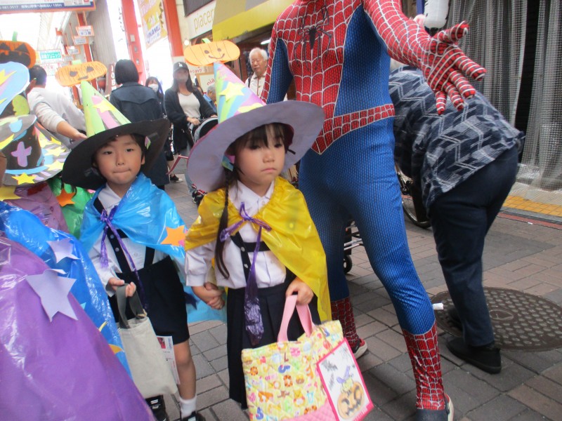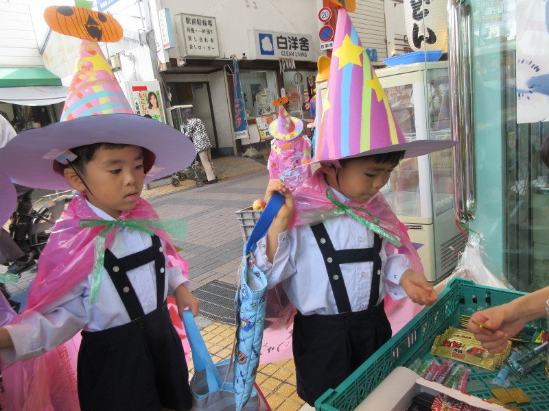 自分で作った帽子とマントをつけて、商店街のハロウィンイベントに参加しました。