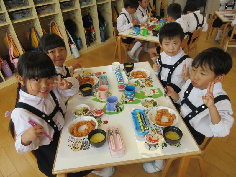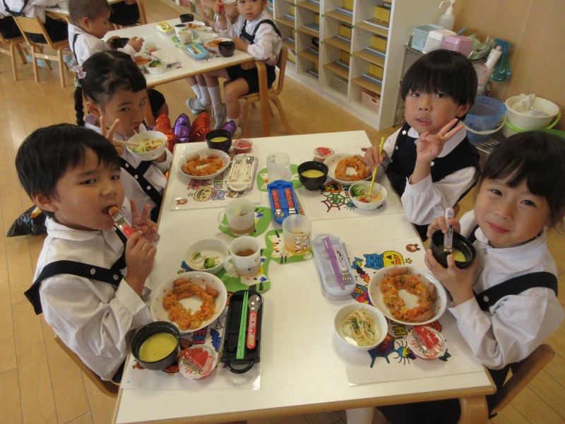 自分で作ったハロウィンのランチョンマットとコースターを敷いて給食を食べました!
