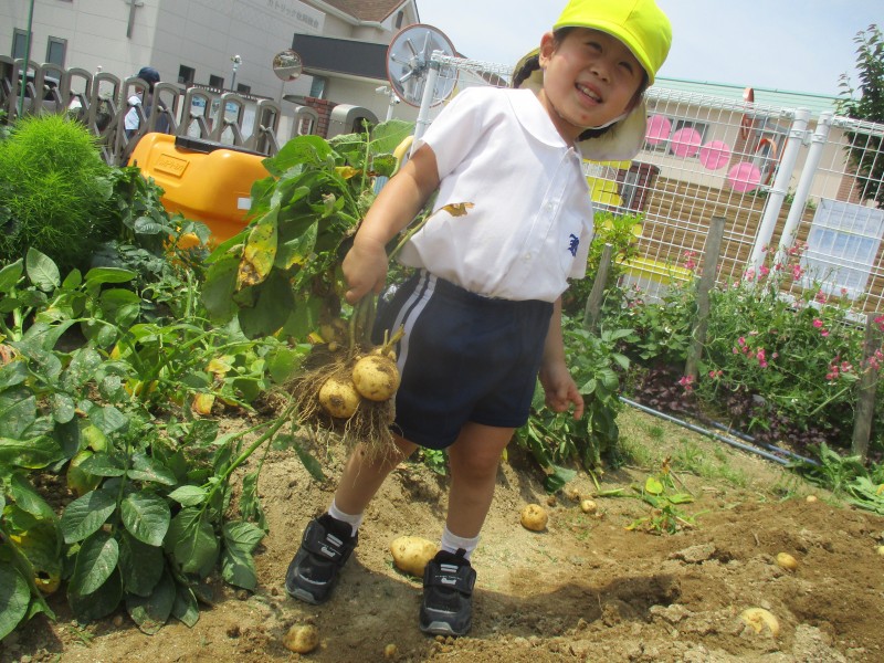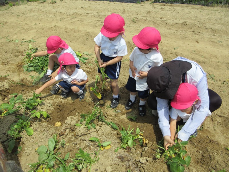 畑でのじゃがいも堀りでは、重いじゃがいもを「うんとこしょ」と頑張って抜く姿が見られ、