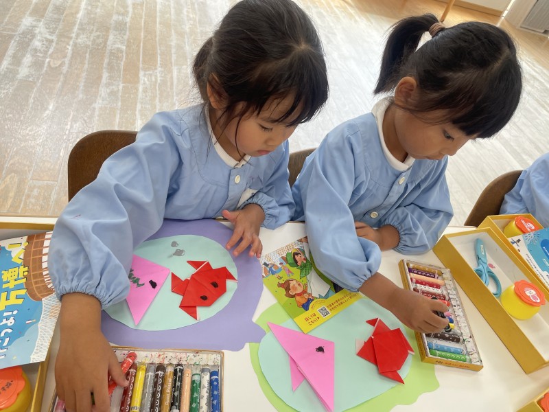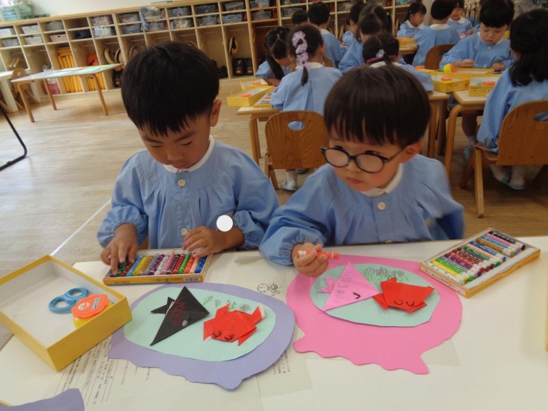 壁面製作では、折り紙で「さかなとかに」を折り、水槽をつくりました。