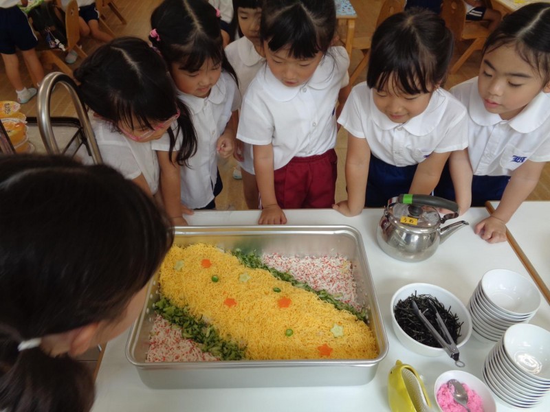 給食のちらし寿司が、天の川になっていました。ふたを開けたとき、大歓声が起こりました。みんなよかったね☺