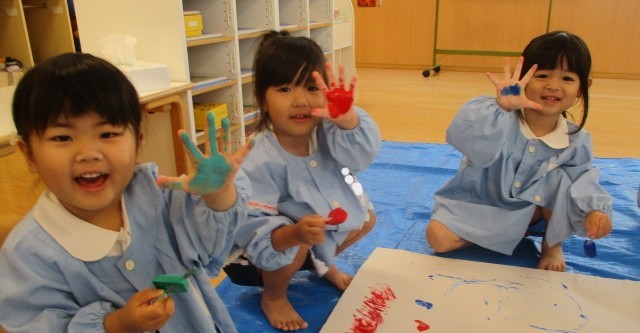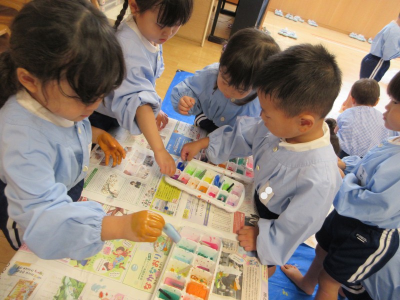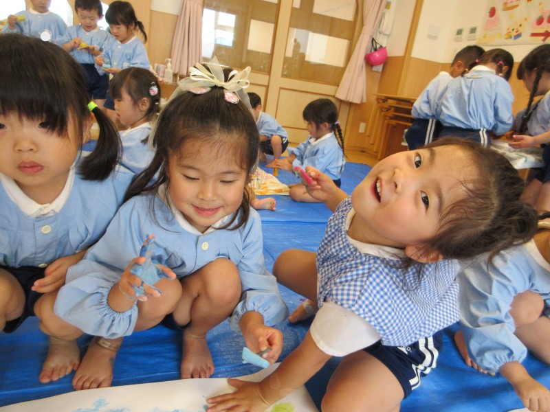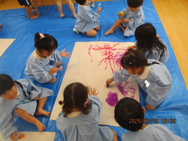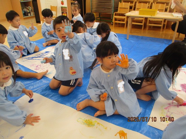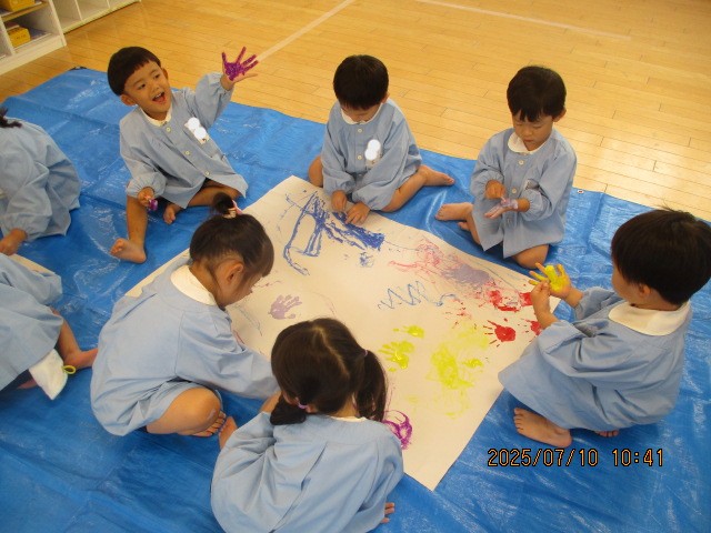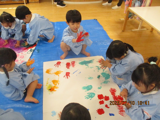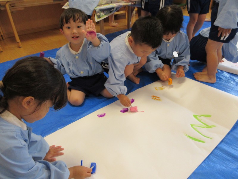 手形スタンプや足形スタンプを模造紙に大胆にぺったーんと押したり、好きな絵を描いて楽しんでいました♪