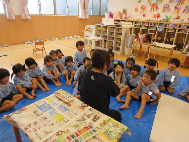 先生が、氷絵の具を手に取り、模造紙に描くと「わぁー✨」と目をキラキラさせていました♡