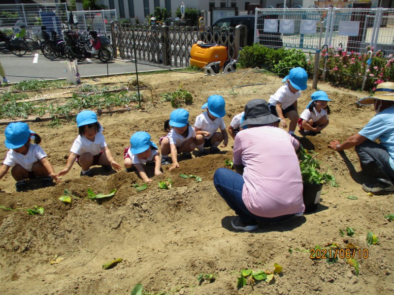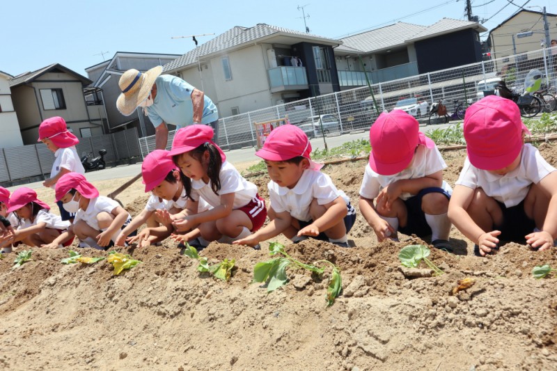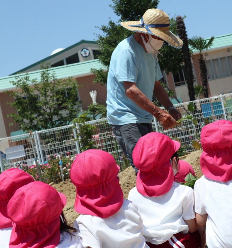 畑のお世話をしてくださっている教会の「石原さん」にサツマイモの苗の植え方を教えていただきました!