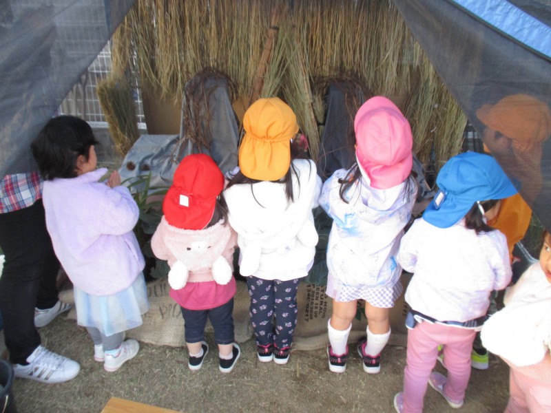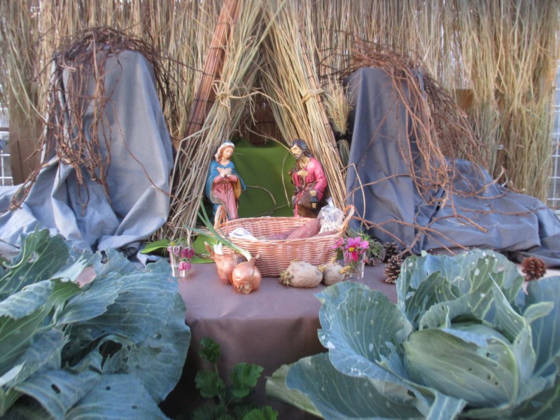 畑に作られた【うまごや】に、マリアさまとヨゼフさまと飼い葉桶を飾りにいきました。