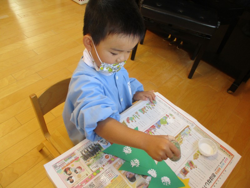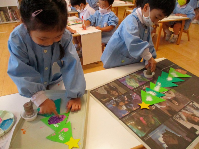 最後に指絵の具でツリーにかざりをつけて・・・・