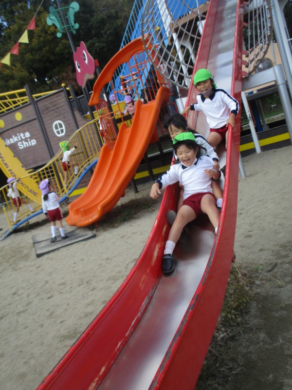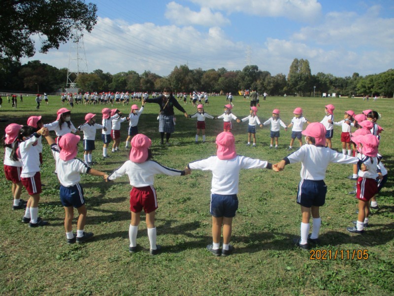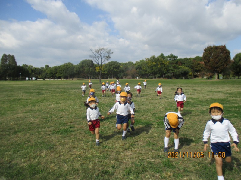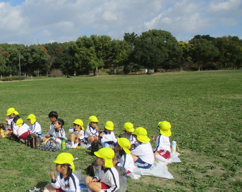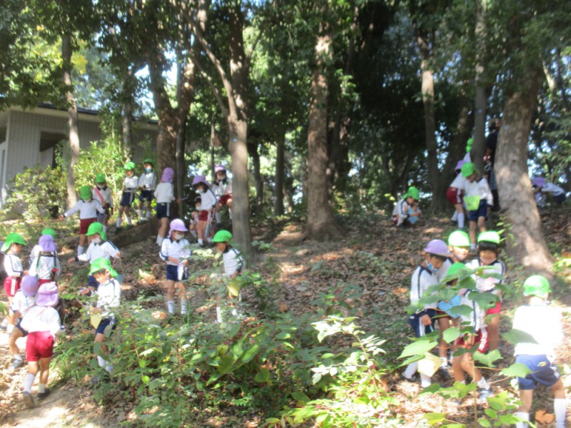 今日はみんなが楽しみにしていた、バス遠足~深北緑地~でした。恐竜広場まで歩き、集合写真を撮ったら、世界に一つしかない自分のどんぐり入れを持ってどんぐり拾いに出発♪